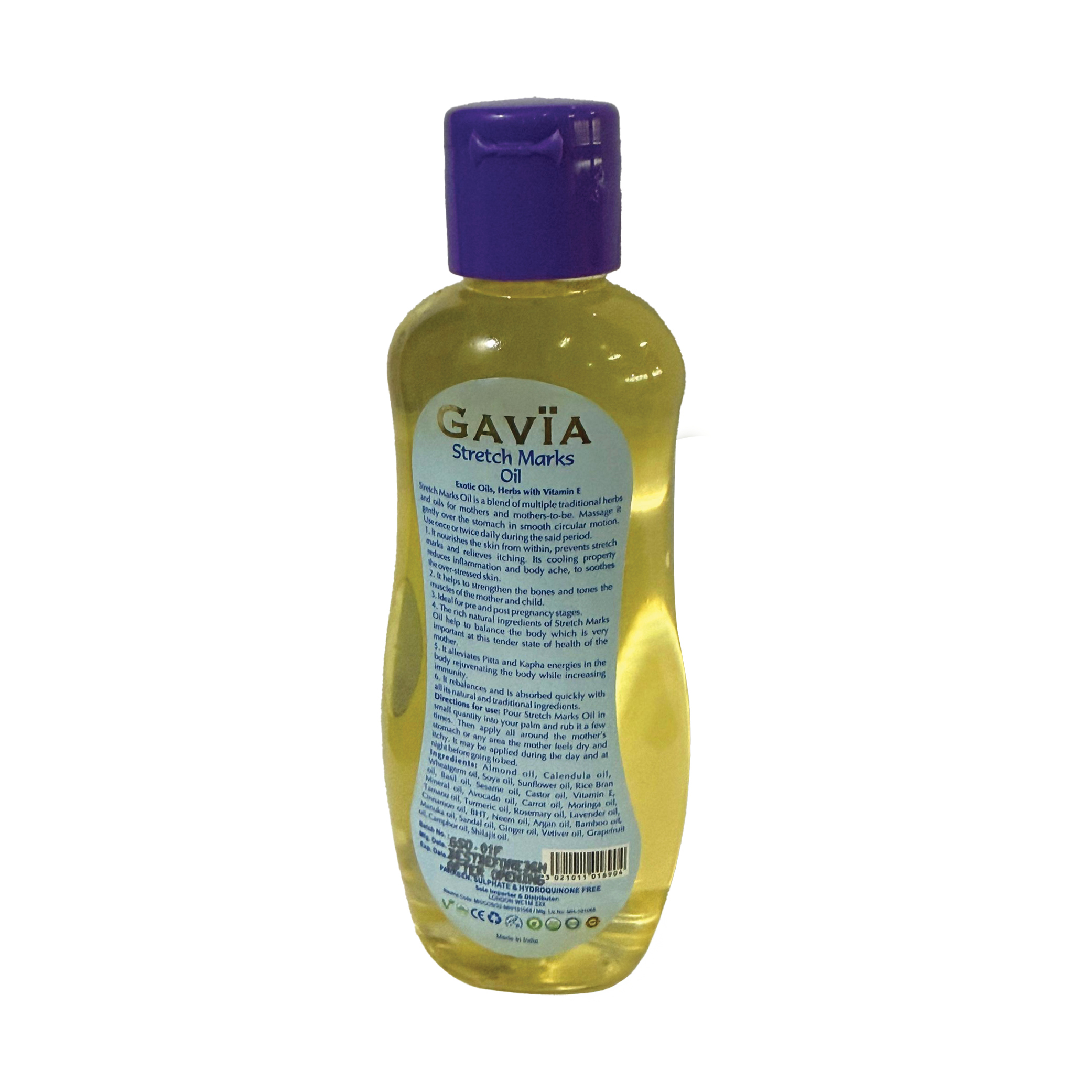 GAVIA STRETCH MARKS oil is formulated with the finest quality ingredients available. It is all natural, free of pesticides and harsh chemicals while being effective and easy to use. Our products are made in small batches to ensure quality control.
